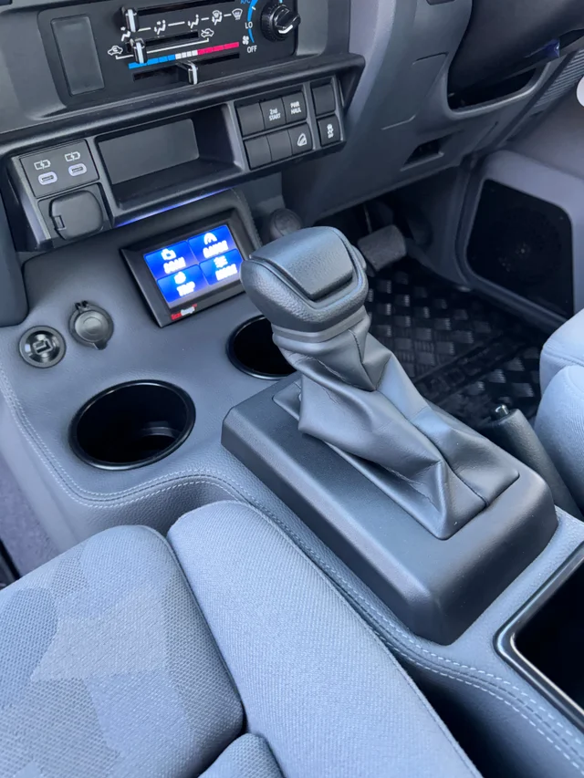 Automatic Full Length Floor Console (Design 10) to suit Toyota 2024 Facelift 79 Series Dual Cab incl. 2 x Jumbo Cup Holders + Square Shaped Tray + Gear Boot + Console Bin with bin lid at armrest height w/ ScanGaugeIII Provision Location: Front, driver side above the gear boot w/ Narva 12v & Dual USB Sockets Location: Front, passenger side Upholstered in DeluxeTrim Dash Vinyl (Dark Grey to match the interior) + 5 switch panel