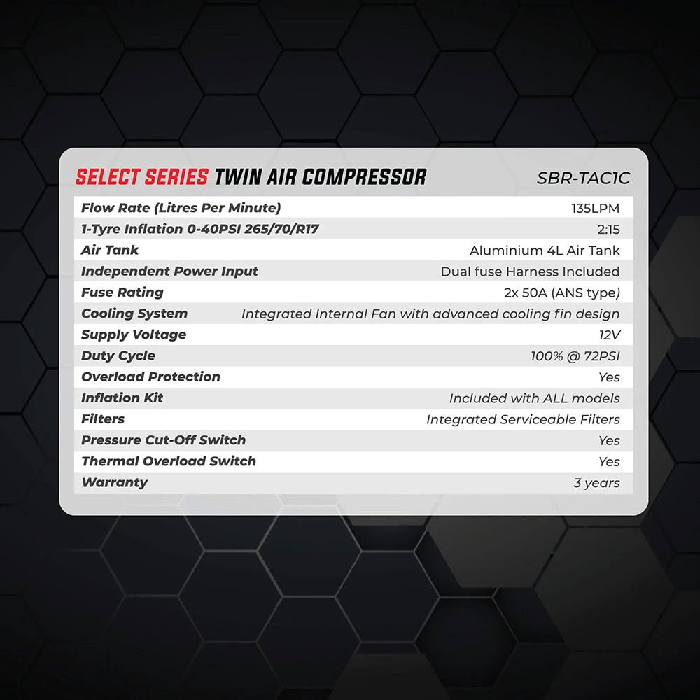 - Torture-Tested in Australia – Put through rigorous testing in some of Australia’s harshest off-road conditions, the Select Series Twin Air Compressor is now ready to handle the toughest environments anywhere in the world.